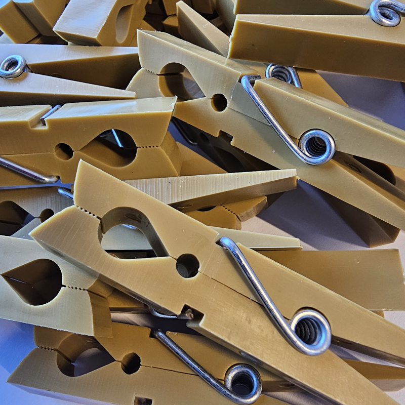 Κατασκευάζονται στην Ελλάδα, στην Πάτρα, από ειδική συνταγή πολυπροπυλενίου υψηλής αντοχής, ώστε να μη σπάνε εύκολα από τον ήλιο, τη χρήση και τον χρόνο. Διαθέτουν σκληρό γαλβανισμένο ελατήριο για σταθερό και δυνατό κράτημα. Παράλληλα, η μπεζ απόχρωσή τους δίνει μια όμορφη “ξύλινη” αισθητική, με όλα τα πλεονεκτήματα του πλαστικού.